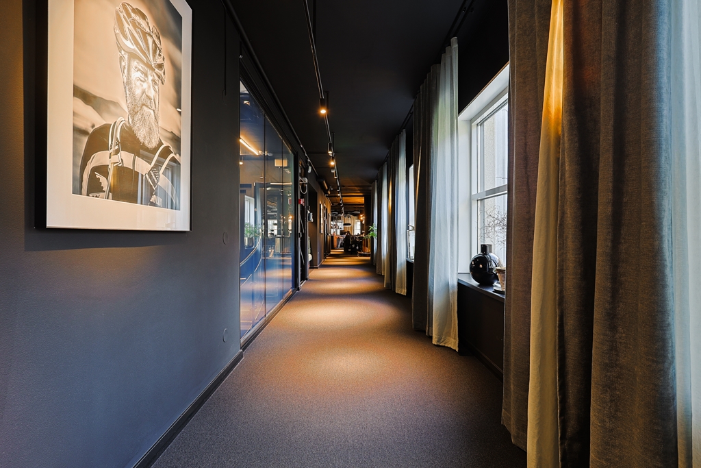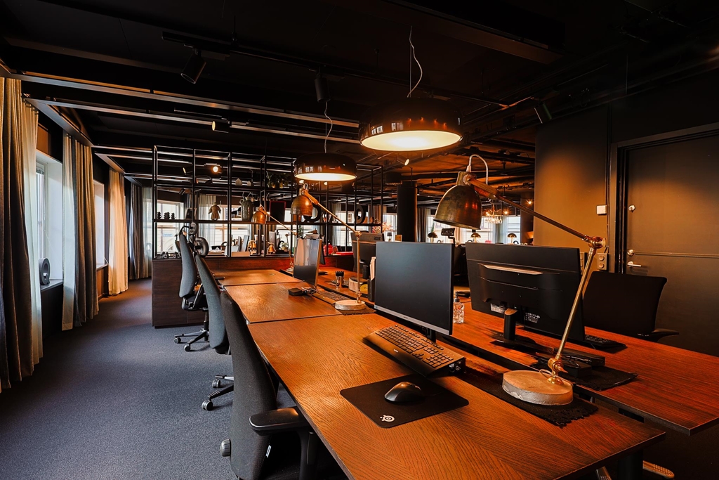 Interiören kombinerar moderna material, varma kulörer och förstklassig belysning som skapar en professionell, kreativ och välkomnande arbetsmiljö.