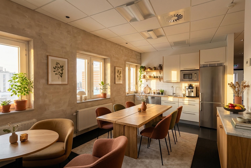 Lokalen är självklart utrustad med toaletter och RWC med dusch som gör det tillgängligt och praktisk för alla medarbetare och besökare. Lokalen har mekanisk ventilation med kyla via bafflar.