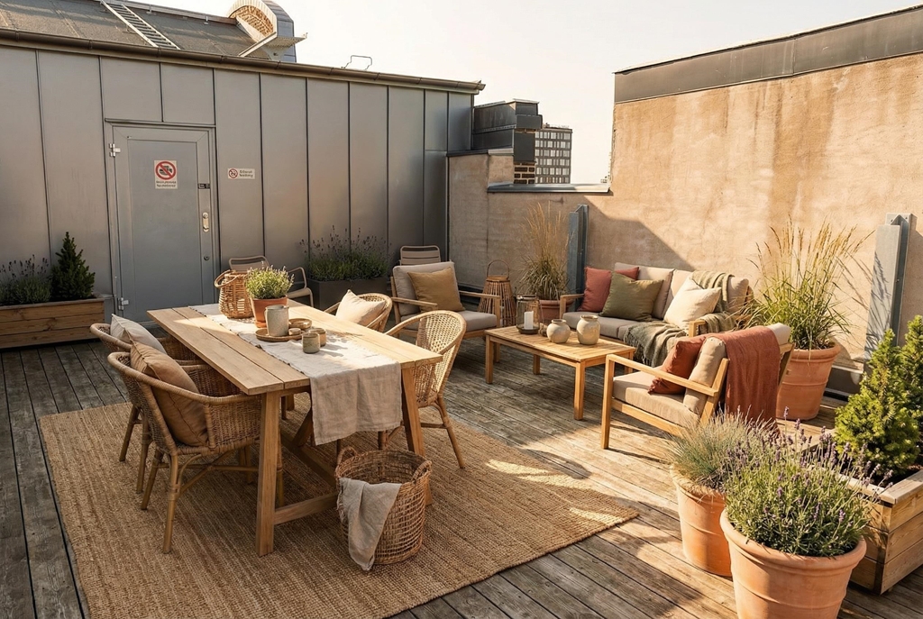 En enastående takterrass med utsikt över takåsarna där ni kan njuta av lunchen.